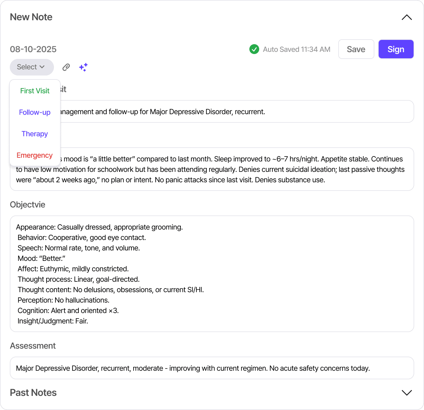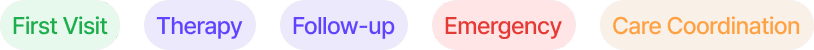 Visual grouping, visit-type tags, autosave feedback, and clear CTAs improve clarity, organization, and confidence.