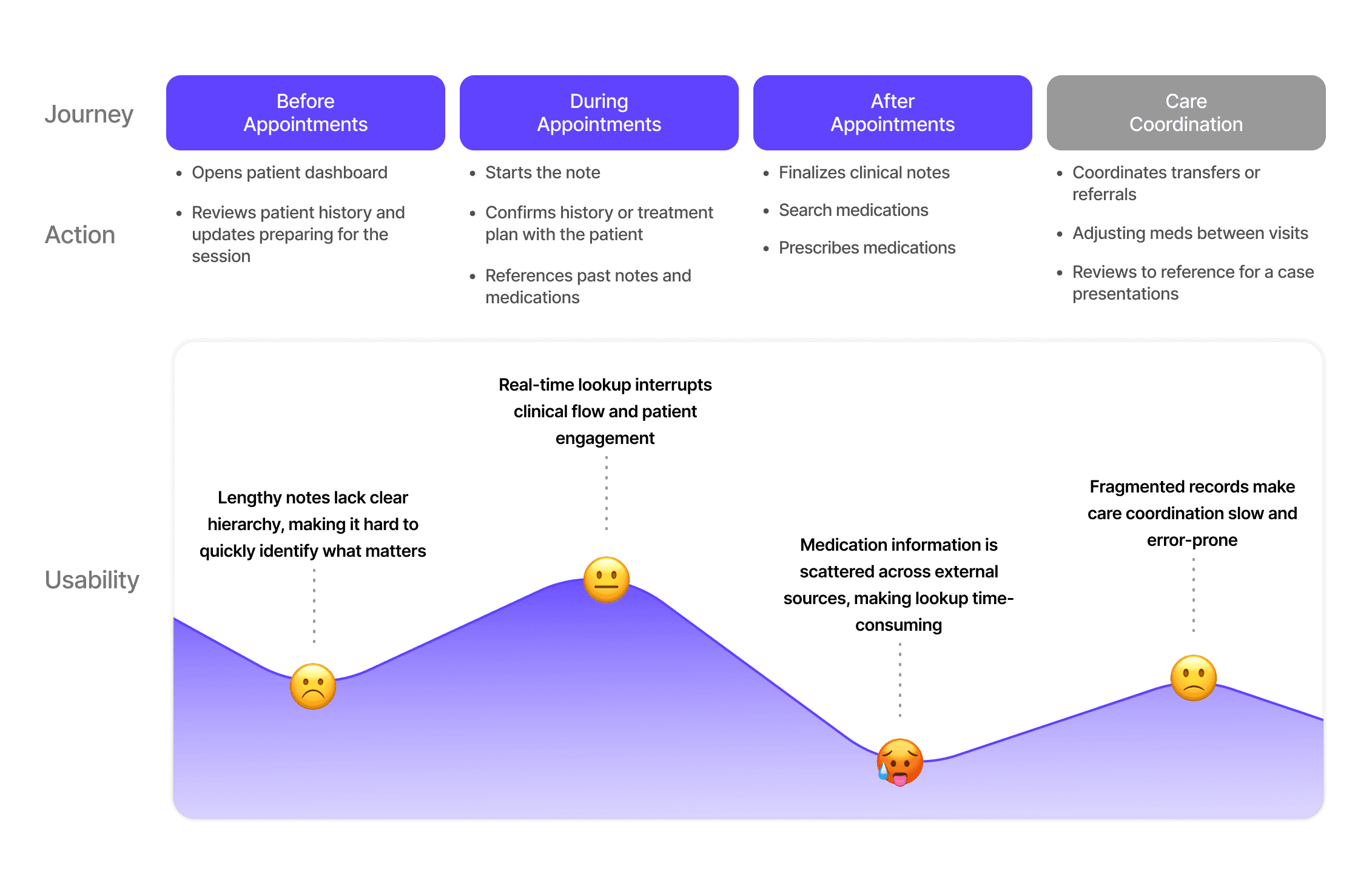 I interviewed five outpatient psychiatrists to map their end-to-end workflow from pre-visit prep to post-visit documentation. The journey map revealed that the highest friction occurs during the patient interaction, where multitasking is critical.