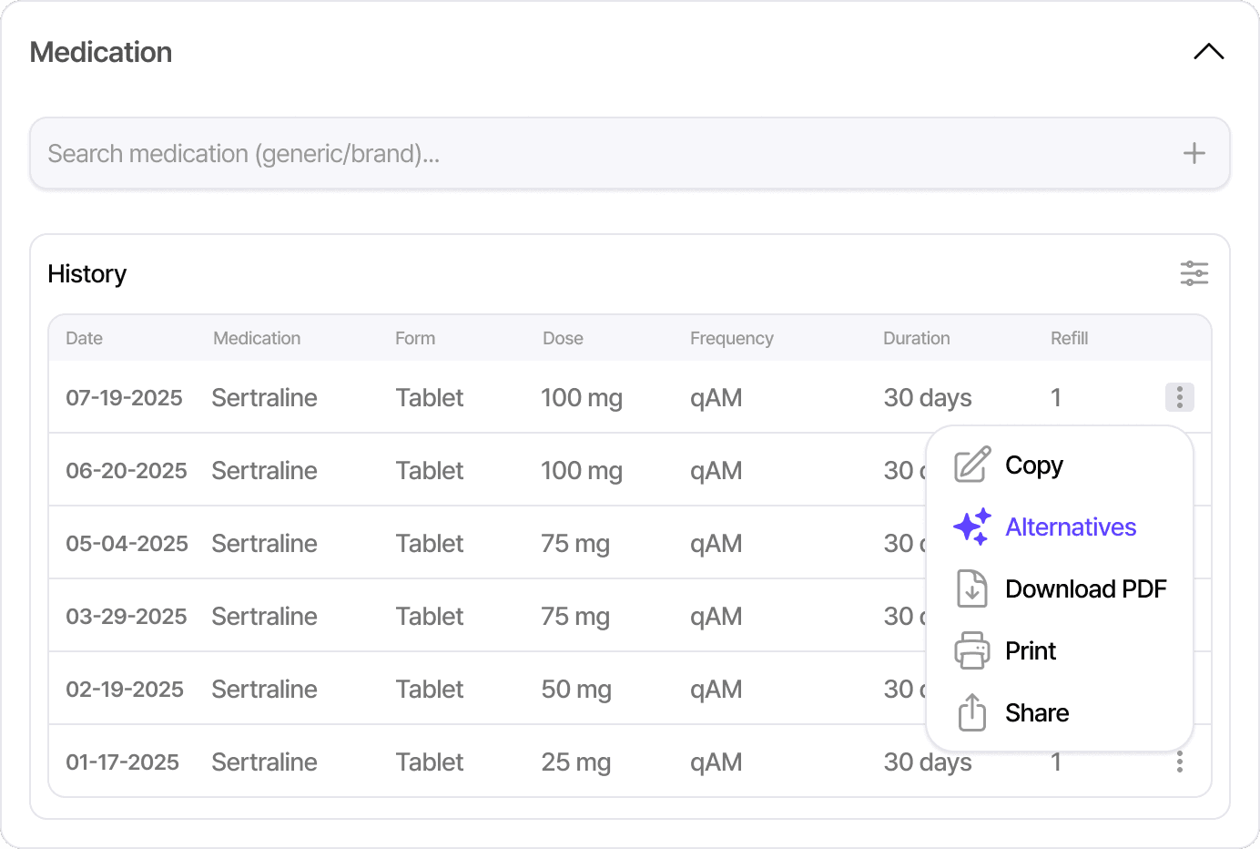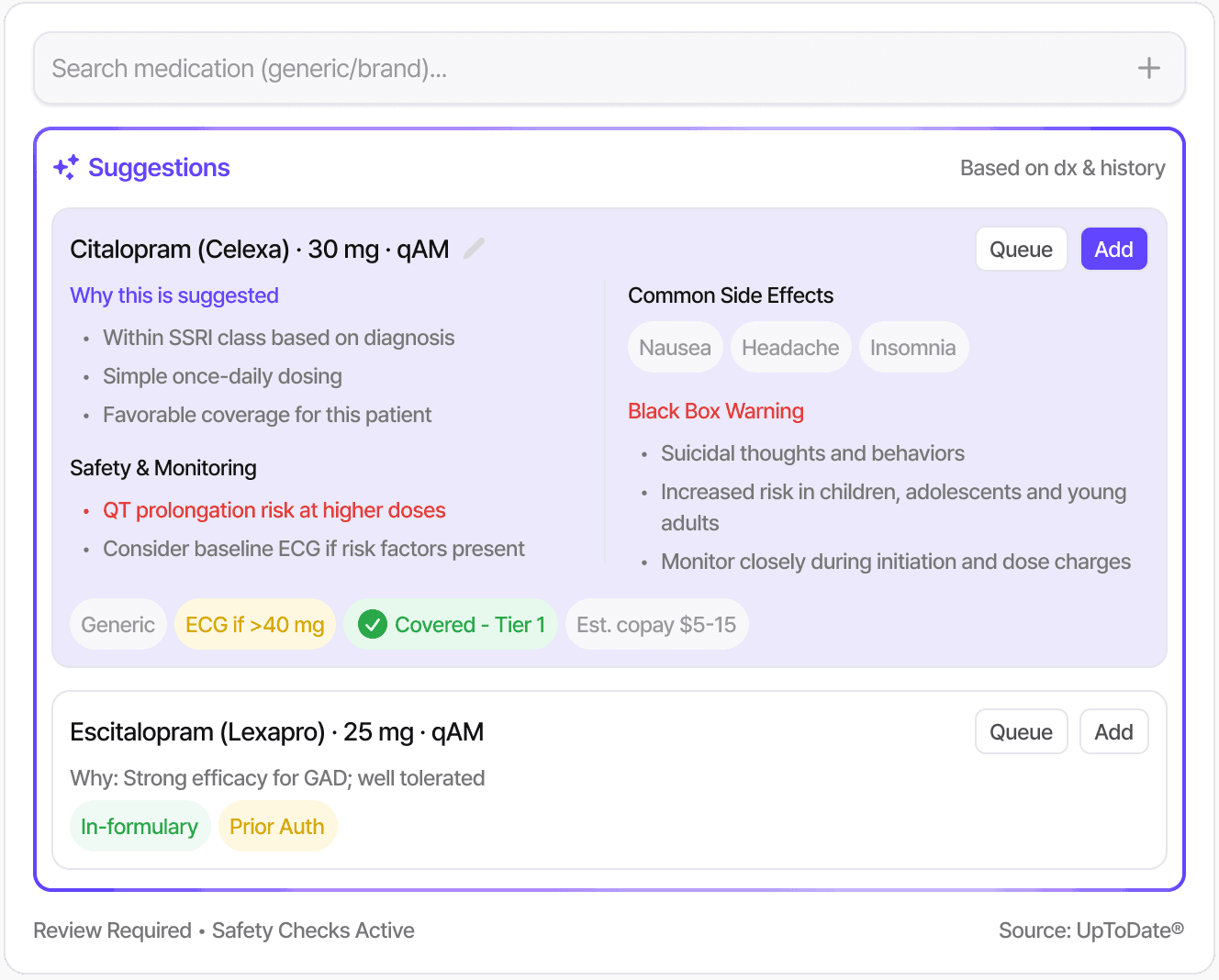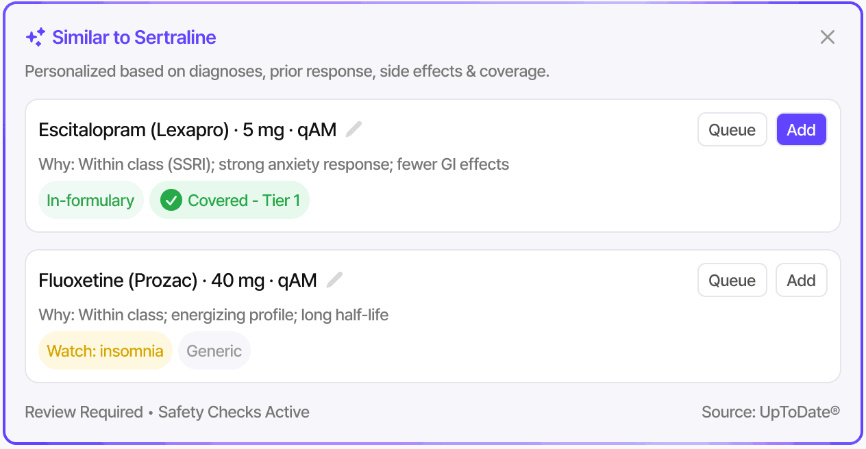Intelligently suggests alternatives based on side-effect profiles and insurance constraints.