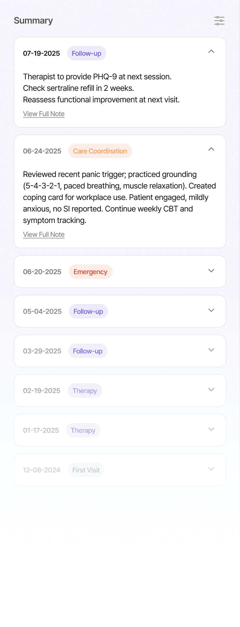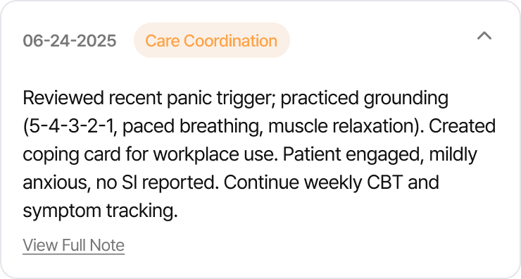 A color-coded, chronological view allows clinicians to scan patterns and history in seconds—no need to open individual notes.