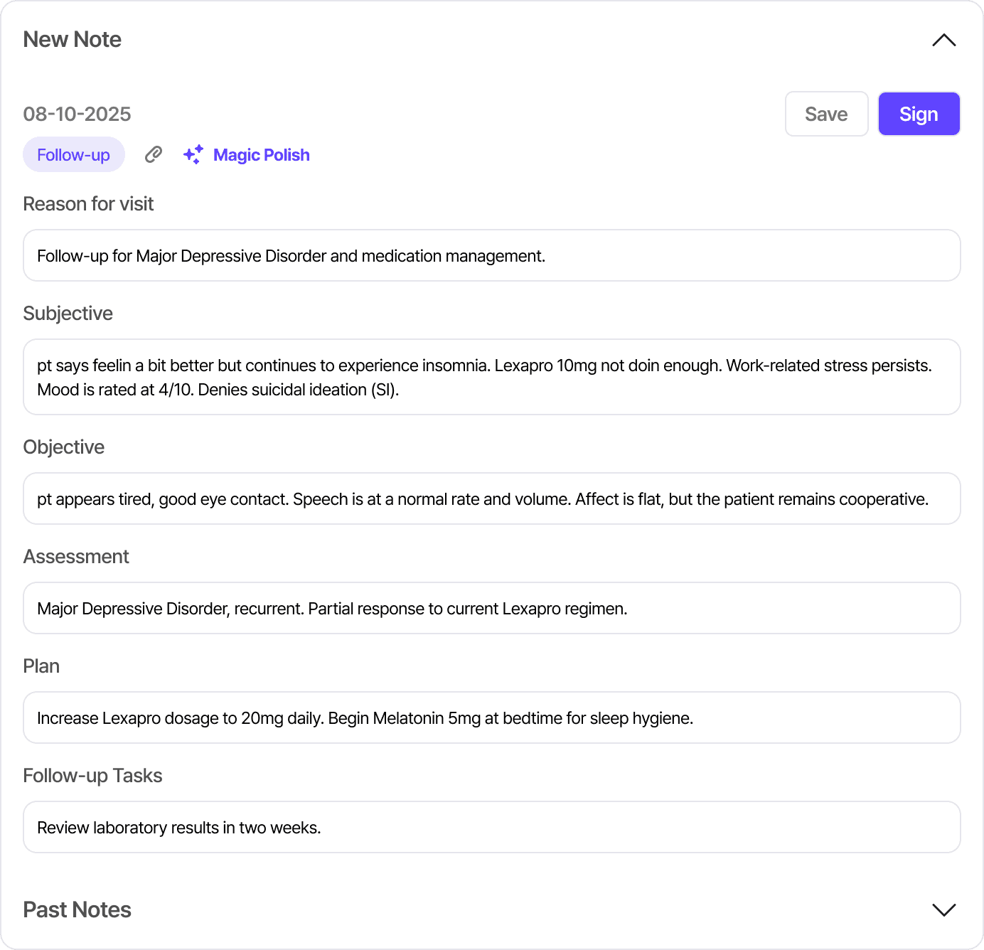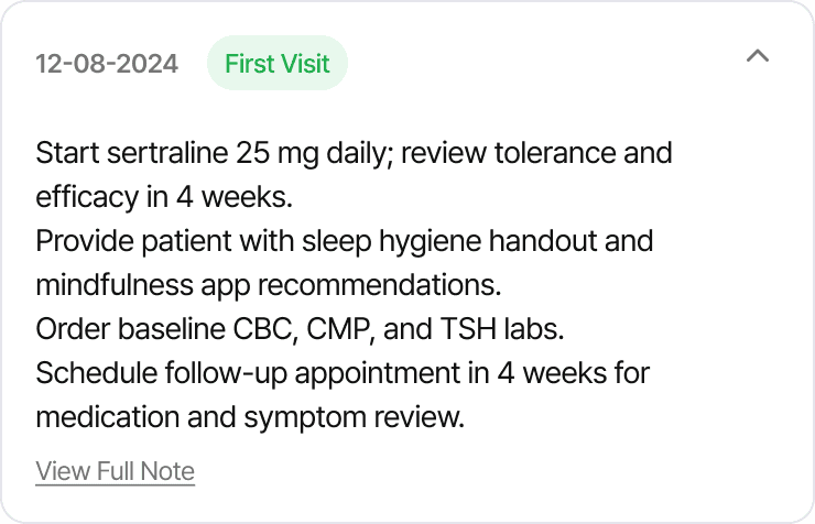 Suggests follow-ups based on visit type and historical cadence, reducing manual administrative friction.