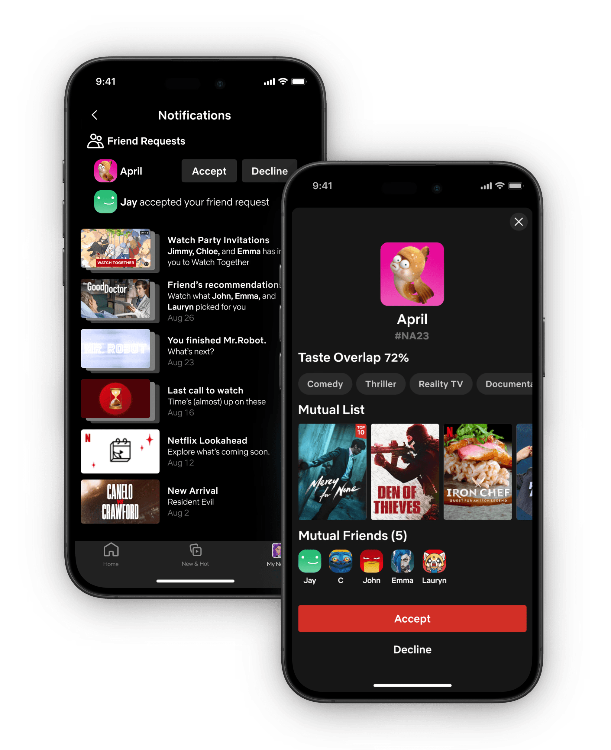From the notification, users can view the requester’s full profile explore mutual shows, friends, and shared interests before choosing to accept or decline.