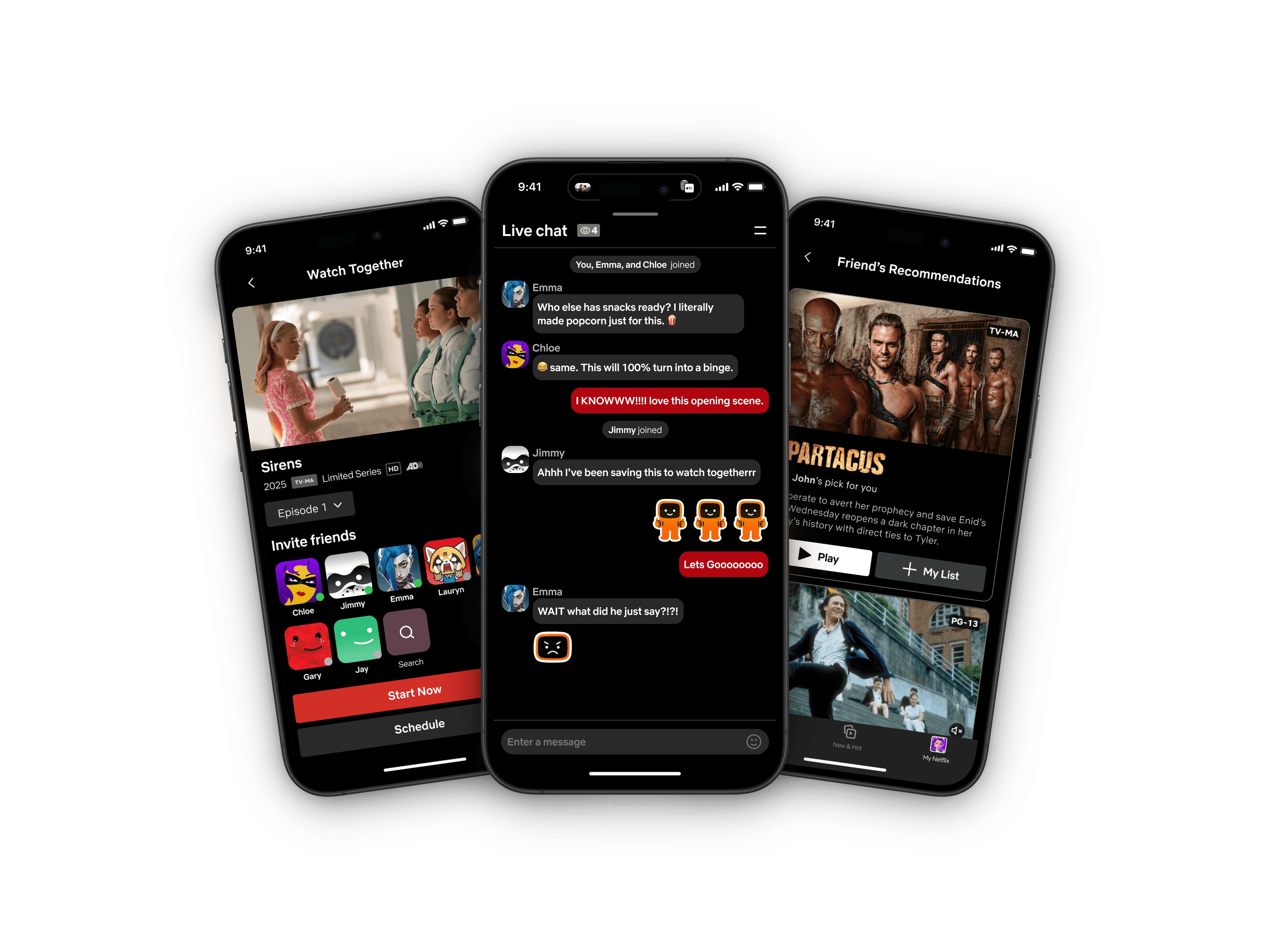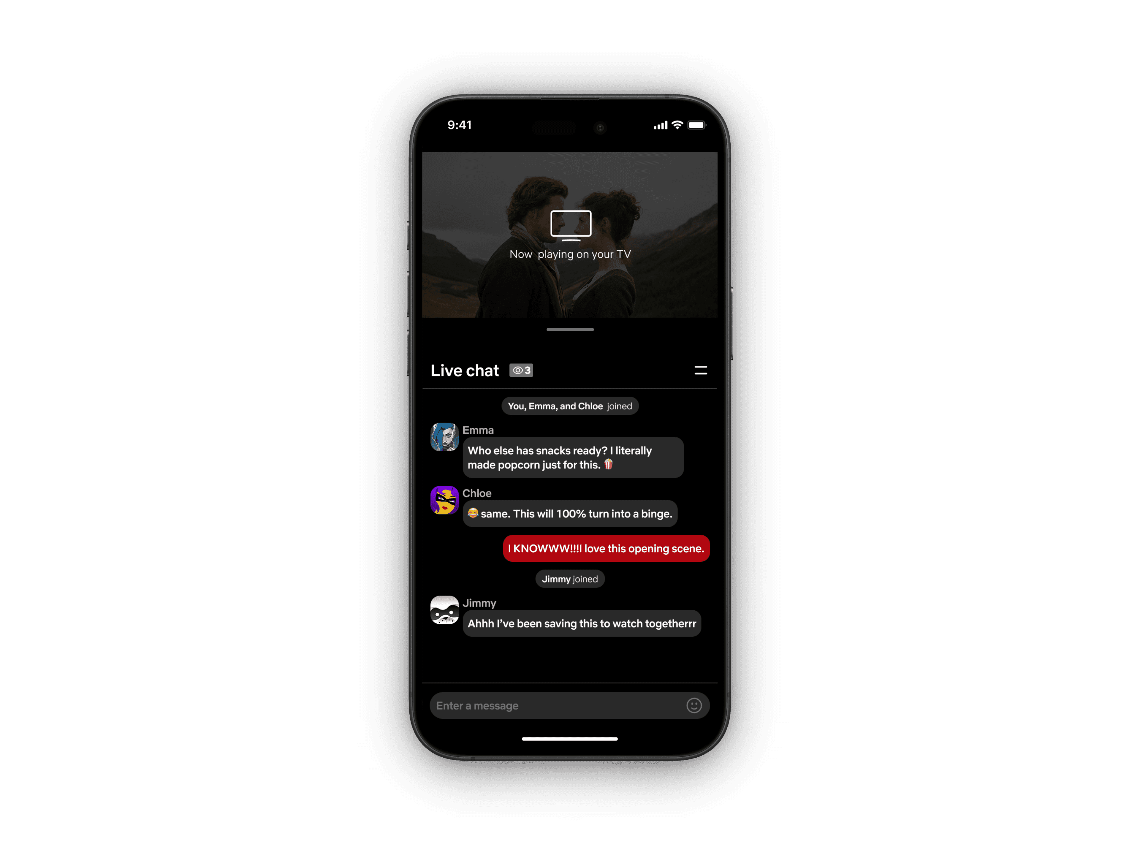 Over 60% of Netflix viewing happens on TV screens. This design extends the experience to mobile, turning the phone into a shared space for live chat and reactions—while the story unfolds on the big screen.
