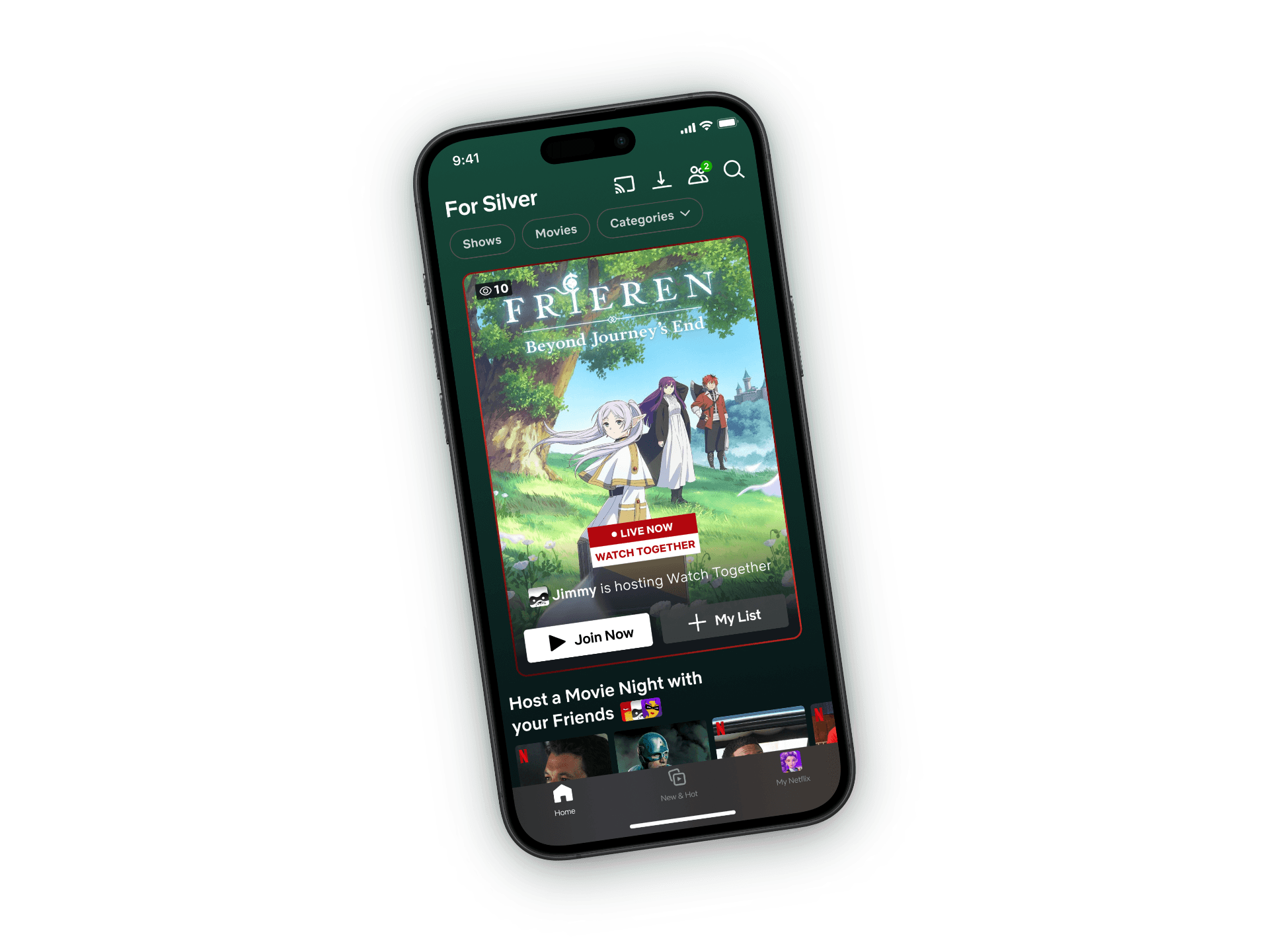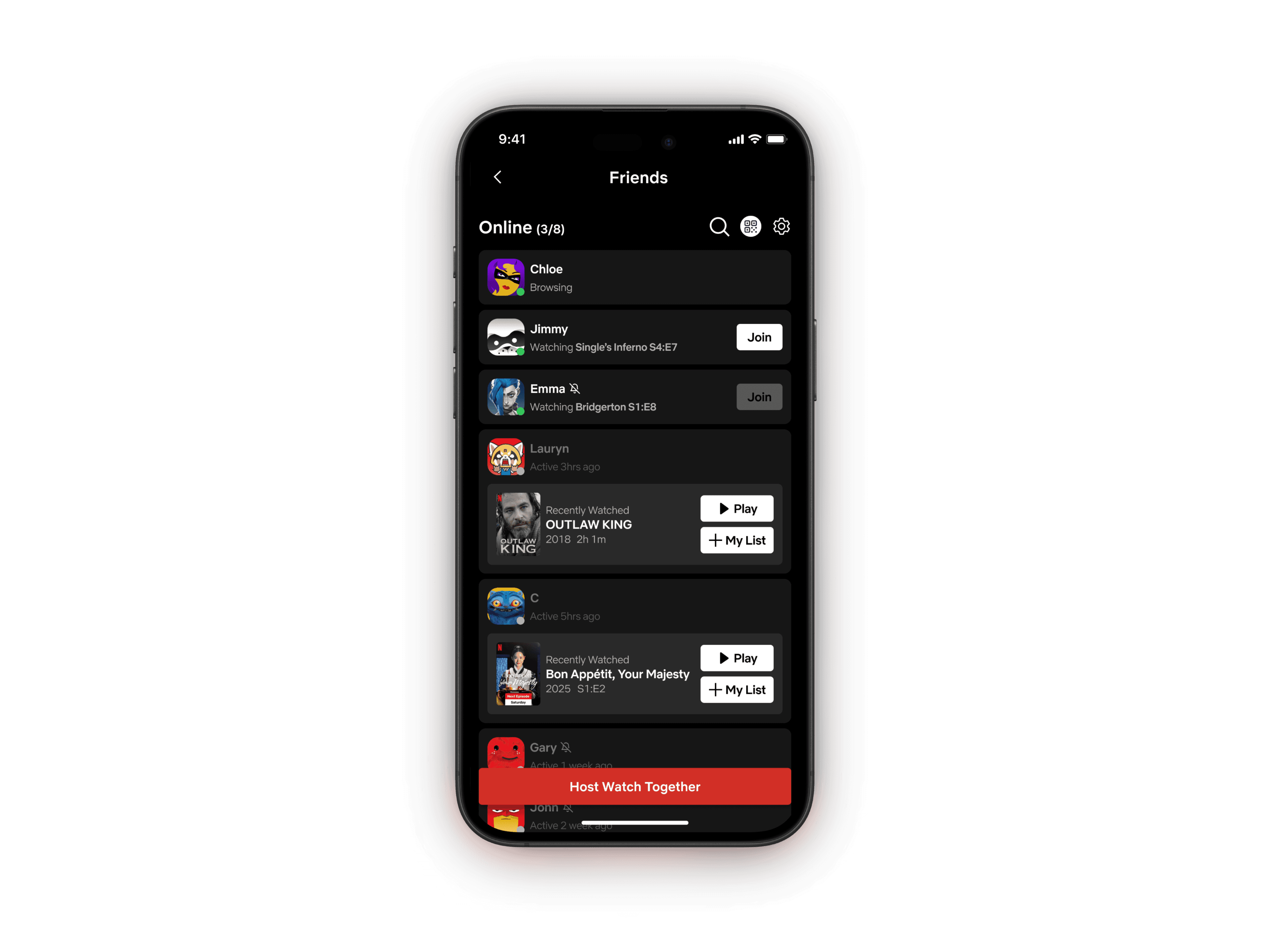 A dedicated space to see what friends are watching, browsing, or have recently finished. Making discovery feel more personal and effortless. Users can instantly join an active session or add a friend's recent show to their own list.