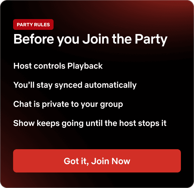 Research on multiplayer UX shows that clear role visibility and control transparency improve participation and reduce early drop-offs. To set clear expectations, “Party Rules” screen was added before joining the watch party.